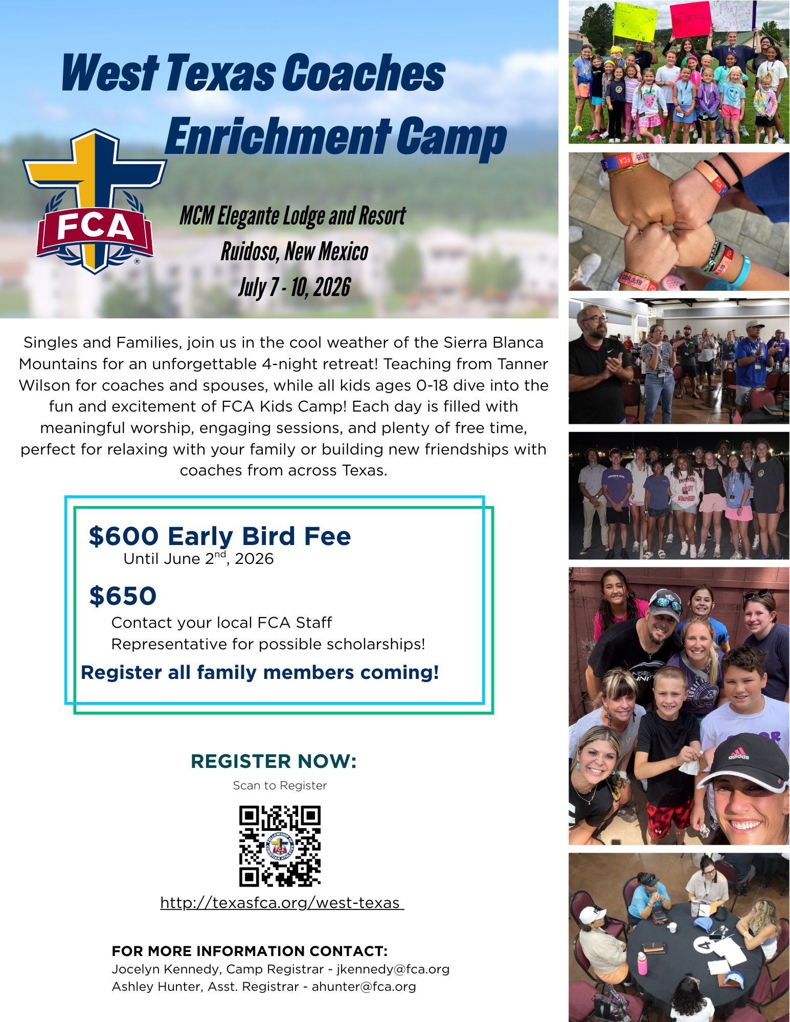This camp focuses on strengthening our Coaches and their families, as they face challenges in season and out of season. A Camp Pastor, Host Couple, and Worship Band will be pouring into these Coaches and their Spouses, while their children will be enjoying all that our Kids Camp (ages newborn - high school graduate) has to offer! Coaches will have the opportunity to meet with other Coaching Staff from across Texas, as well as getting quality family time in the cool mountains of Ruidoso.